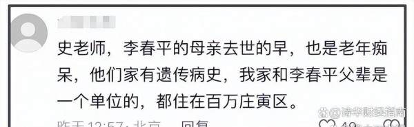 根据现有资料显示,李春平的母亲生前同样患有类似的老年痴呆症状,这表明其家族存在明显的遗传倾向。
