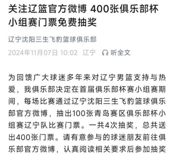 关注辽宁男篮宣布最新决定,狠狠打脸郭艾伦,双方恩怨结下了!在CBA俱乐部杯赛即将开始的时候,辽宁队突然宣布了一个令人意外的决定。在前三轮比赛中,每场比赛将送出400张门票,总计1200张。这一消息迅速在球迷圈是炸开了锅。