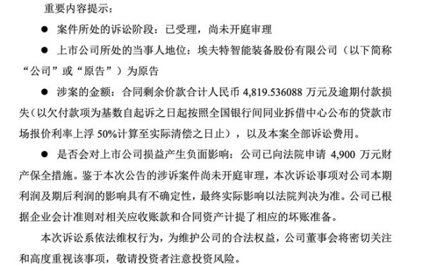 公告显示,埃夫特与宜春合众在2020年至2022年期间签订了多个项目合同,且项目已经验收完成。然而,宜春合众尚欠4819万余元未付。鉴于宜春合众系合众新能源的分公司,埃夫特要求合众新能源对宜春合众不能清偿的债务承担补充清偿责任。