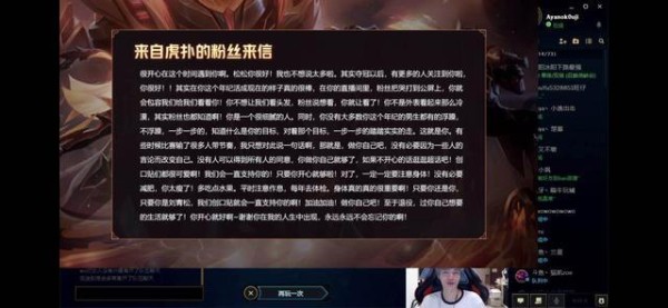 此前LWX就已经单人整过FPX冠军皮肤的活动了,与明星黄子弘凡一起开黑打游戏,顺便与玩家SOLO送薇恩的冠军皮肤,而刘青松的冠军活动则要显得简单很多,只需要读一下粉丝的来信就可以了。不过这对于刘青松来说也不是一件简单的事情,毕竟在刘青松身上的梗太多了,最近一直被小天等人消费的就是撕破伤口丶的梗了。