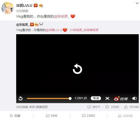 郑恺被拍到新恋情,虽然并未正式承认,但是也是引起了极大的热度。郑恺的新恋情瓜还没吃完,张铭恩在微博发了一则帖子:“Vlog是你的,你是我的”,并附上了一段VLOG,艾特了徐璐正式公开两人的恋情。随后,徐璐也转发了这条微博,回应表示“Vlog是我的,你也是我的”,承认两人的恋情。