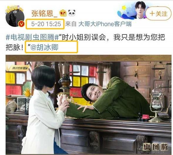 张铭恩和胡冰卿两个人在今年一起合作了《虫图腾》这部剧,而在520也是为了给剧做宣传,发文时小姐,别误会,我只是想为您把把脉,这条微博也是@了胡冰卿。也许那时候看到张铭恩这条520文案只是觉得张铭恩可能是为剧做宣传,但是看到二人在停车场拥抱亲吻的画面后,也是有大波网友们感叹:张铭恩也快要像罗志祥那样糊了。
