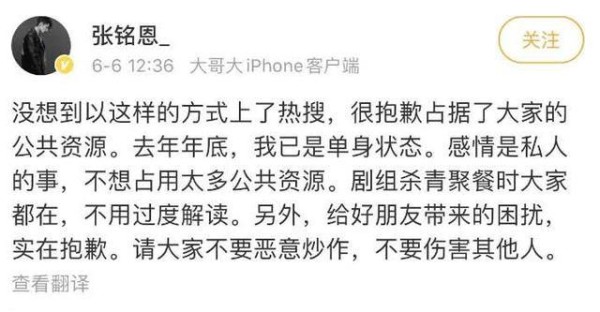 张铭恩在和胡冰卿被拍到以后也是在中午发文澄清感情是私人的事,不想占用太多公共资源,另外给好朋友带来的困扰实在抱歉。张铭恩这条文案发出来以后不仅上了热搜,还遭到很多网友们的吐槽,并且同情徐璐,徐璐可能对张铭恩和胡冰卿的事情还不太知道。