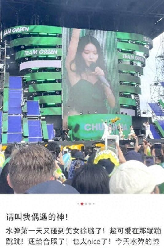 7月6日,有粉丝在韩国水弹音乐节偶遇徐璐,并晒出两人合照发文称“碰到了美女徐璐,蹦蹦跳跳超可爱”