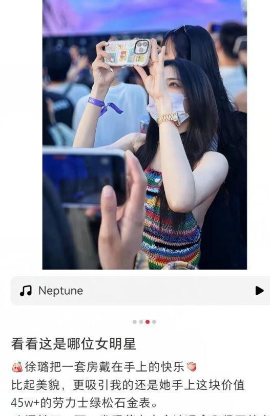 不得不说,徐璐是真的喜欢参加音乐节,在这次的韩国水弹音乐节之前就有人曾拍到徐璐在其他音乐节现场的画面,画面中可以看出她穿着时尚且大胆,手上戴的手表更是引人注目。有粉丝表示,这是劳力士价值45万,好家伙,45万可以在小城市买房了,不得不佩服徐璐,手上戴着“一套房”出现在人群当中,心也是真大。