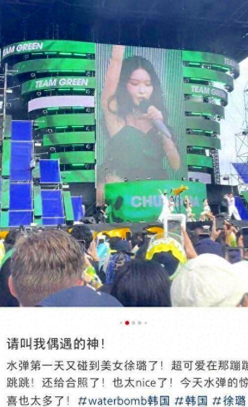 7月6日,在韩国水弹音乐节上,一些粉丝偶遇到了徐璐,随后发布了一张两人的合照,并在文章中写道“遇见了身着美丽的徐璐,整个人都跳跃起来,非常可爱”。