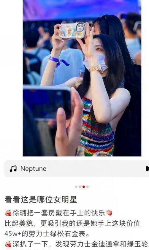 不可否认,徐璐对参加音乐节有着天然的喜爱。此前有人曾记录到她在其他音乐节现场的画面,从中可以看出她着装时尚而大胆,手腕上的手表更是抢眼之物。