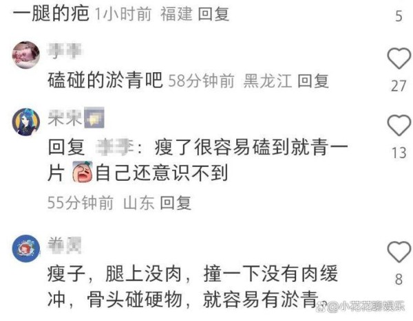 然而,细心的网友在欣赏照片的同时,也发现了一个小细节。他们注意到徐璐的双腿虽然纤细修长,但皮肤上却布满了多块淤青。这些淤青的痕迹引发了网友们的热议和猜测,纷纷关心起徐璐的身体状况。有人猜测可能是徐璐在日常生活中不小心磕碰到了,也有人担心她是否遭遇了什么意外。