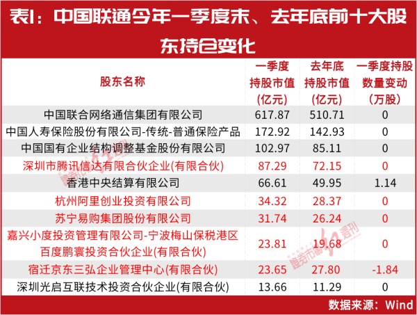 而这也让布局其中的投资者收获颇丰,其中更是不乏明星资本。如中国联通,在公司今年一季度末的前十大股东名单中,“腾讯系”、“阿里系”、“苏宁系”、“百度系”和“京东系”等公司均再次现身,并且在持股数量相较去年四季度末普遍没有变动的情况下,多数持股市值增长明显,分别增长15.14亿元、5.95亿元、5.51亿元、4.13亿元和-4.14亿元(见表1)。其中,“京东系”持股市值的减少,主要是因为宿迁京东三弘企业管理中心(有限合伙)(以下简称“京东三弘”)继去年第四季度期间减持中国联通1.12亿股之后,在今年一季度期间再次减持了1.84亿股。