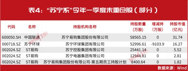 据梳理,“苏宁系”还重仓了苏宁环球(2.700, 0.03, 1.12%)和ST易购(1.700, 0.00, 0.00%),均为自家产业(见表4)。其中,“苏宁系”掌门人张近东的胞兄张桂平重仓持有苏宁环球,“苏宁系”的苏宁控股集团有限公司、苏宁电器集团有限公司以及苏宁易购集团股份有限公司-第五期员工持股计划联合重仓了ST易购。在这之外,张近东同样为ST易购的前十大股东之一,并且位列第二。