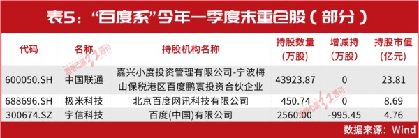 “百度系”和“京东系”则在围绕产业链布局,如主打人工智能领域的“百度系”就主要在围绕这个方向,同时重仓了国内智能投影设备行业龙头极米科技(117.800, 3.92, 3.44%)和“银行数据+AI第一股”宇信科技(22.850, 0.17, 0.75%)(见表5)。