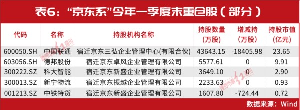 仓储物流龙头“京东系”则重仓了快递行业公司德邦股份(14.860, -0.12, -0.80%)、智能物流公司科大智能(11.980, -0.36, -2.92%)、综合物流服务公司新宁物流(4.450, -0.07, -1.55%)、冷链物流公司中铁特货(4.290, -0.02, -0.46%)(见表6)。