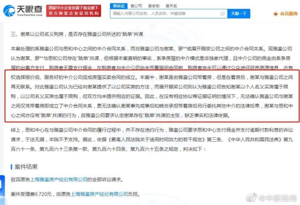 法院审理认为,在没有相应协议等证据证明的情况下,无法确认雅銮公司与谢某之间仅凭带看房即成立了中介合同关系,更无法确认谢某事先或事后知晓会承担带看房后另行委托其他中介的法律后果,谢某与思和中心之间没有“跳单”共谋的行为。最终,法院裁定驳回上海雅銮房产经纪有限公司的全部诉讼请求。