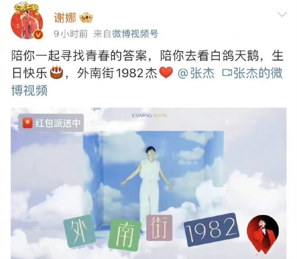 谢娜卡零点在微博发文为张杰庆生:“陪你一起寻找青春的答案,陪你去看白鸽天鹅,生日快乐。”谢娜还替张杰宣传了新专辑《外南街1982》,外南街是成都的地名,张杰的家里有可能在那边;张杰是1982年出生的,所以这张专辑很有意义。