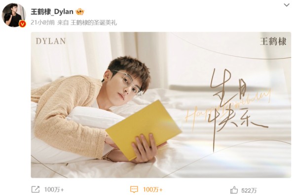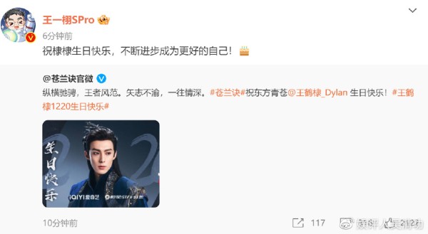 首先来说王鹤棣的粉丝,12月20日零点刚过没几分钟,王鹤棣的生日微博的转发量就超过100万了,这就是顶级流量的待遇。再来看《苍兰诀》官微,发文为王鹤棣庆生了;该剧的制片人王一栩也发文送祝福:“祝棣棣生日快乐,不断进步成为更好的自己!”