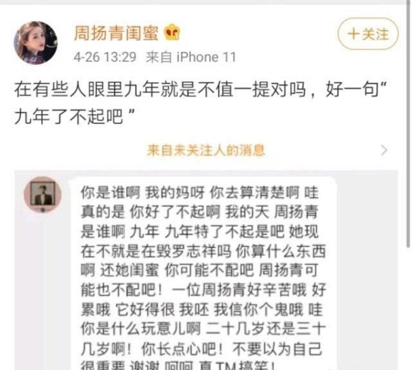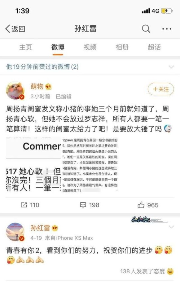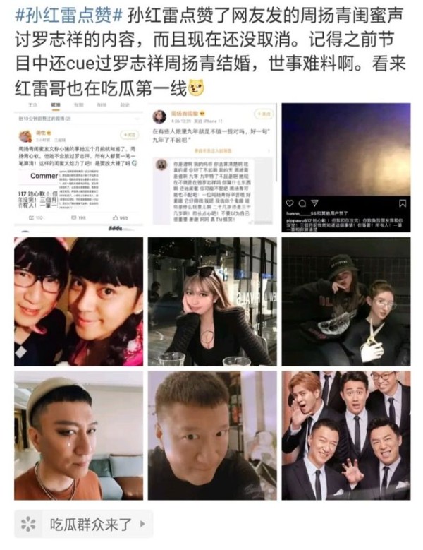 还有就是今天的时候,孙红雷竟然点赞了周扬青闺蜜骂罗志祥的微博,众所周知,孙红雷和罗志祥在《极限挑战》里面一开始两人都是极限三傻中的成员,这二人看起来都很神经大条,没想到,兄弟之情说倒就倒,孙红雷点赞这个微博并且长时间没有取消,是否也说明了对罗志祥做法的鄙视呢?看来也是向着周扬青的。