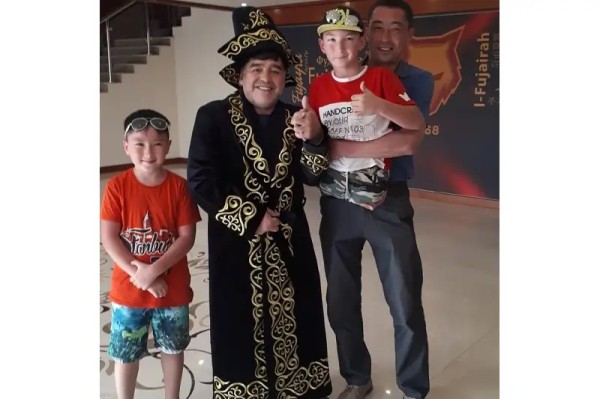 哈通社/阿斯塔纳/4月26日 -- 先天性无腿男孩阿里·吐尔汗别科夫日前与阿根廷传球足球明星迭戈·马拉多纳会面。