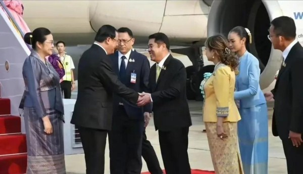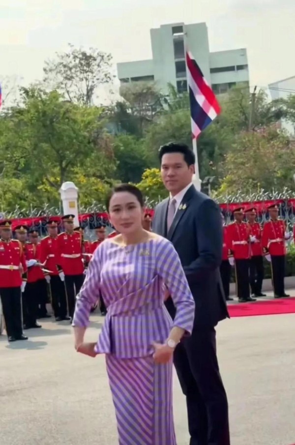 2025年2月20日,老挝总理宋赛和他的夫人缓缓走下舷梯,走入泰国曼谷素万那普机场的停机坪。红毯两侧,编织的花朵和持花的仪仗队士兵,形成了一幅既庄重又温馨的画面。泰国总理佩通坦和她的丈夫皮塔卡并肩而立,佩通坦身穿浅紫色条纹套裙,与宋赛夫人同样的浅紫色传统服饰形成和谐的色彩对比。两位领导人在相视一笑的瞬间,成为媒体镜头捕捉到的这次外交活动的首个“亮点”。