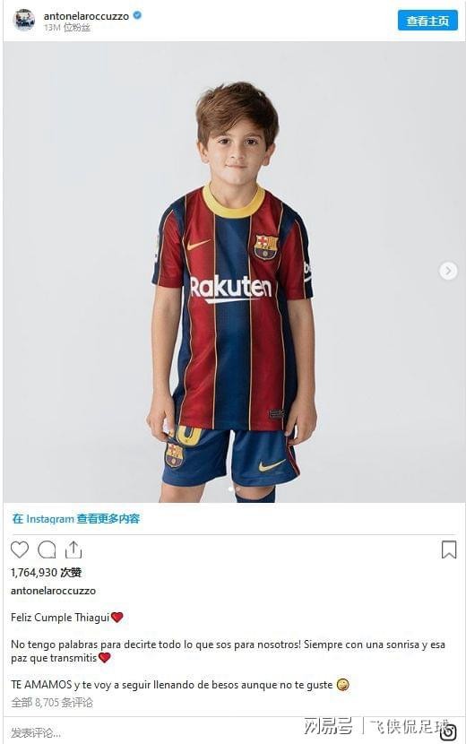 在安东内拉·罗库佐发布的帖子里,梅西的大儿子蒂亚戈身穿巴塞罗那球衣,她写道:“蒂亚戈生日快乐。”