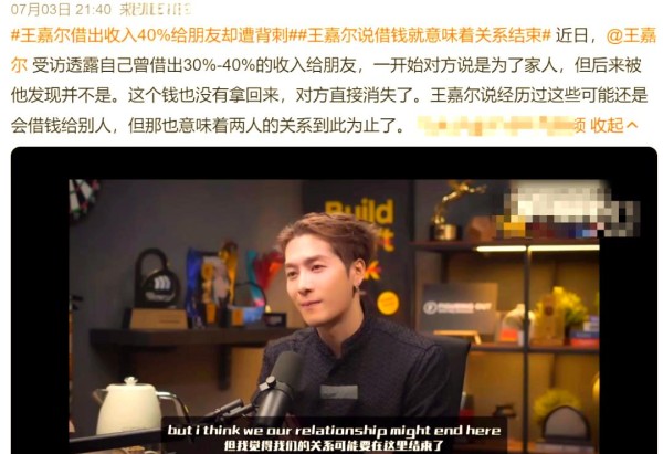 王嘉尔在娱乐圈中以重情重义著称,但他也经历过被朋友利用的背叛。他曾经慷慨地将30%到40%的收入借给朋友,结果在获得资金后,这些朋友却音讯全无。这一事件让王嘉尔在后来的借钱问题上持谨慎态度。尽管如此,他还是表示,仍然愿意借钱给值得信任的人,前提是这种信任经过确认且关系明确。