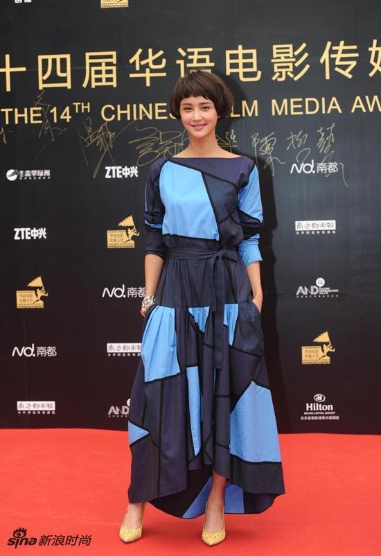 2014年10月11日,北京,第14届华语传媒大奖红毯举行,张歆艺亮相。 她身着chloe2015早春系列蓝黑色块拼接裙亮相,蘑菇bobo头是装嫩利器,但和模特呈现出的“文艺”风相比,张歆艺穿得太长了,优雅的黄色镂空尖头鞋似乎也和洒脱不羁的裙子不太搭配。