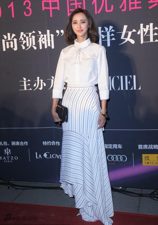 2013年10月23日,北京,《时装LOFFICIEL杂志》在京举行“2013中国优雅盛典”,张歆艺身穿白色条纹礼服裙,手拿黑色手包,脚踩金色尖头高跟鞋, 透出一股优雅女人的气质。
