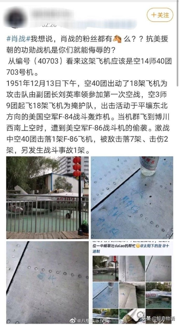 今日,军方日报发布报道“功勋战机被涂网红姓名”中提到机翼上有某流量明星的名字,并呼吁“文物不容亵渎,追星也要有度”,后图片被爆坐实某流量明星为肖战名字,在功勋战机上涂鸦这个是真的过分了,道德底线在哪里?