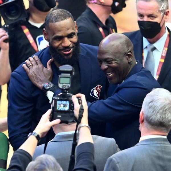 乔丹与詹姆斯这两位NBA历史以来最具影响力的球员在此刻相遇,莫名有一种时空交融的感觉。二人相遇时,都是咧着嘴笑个不停,还接连多次拥抱,英雄惜英雄。