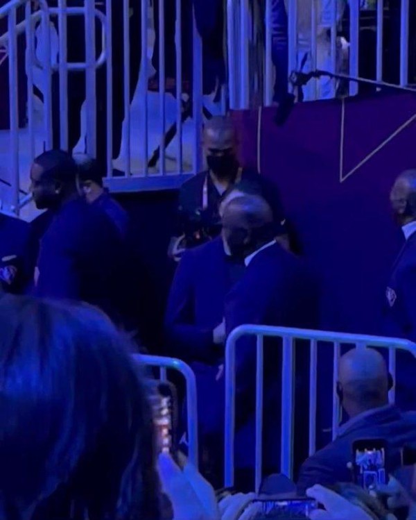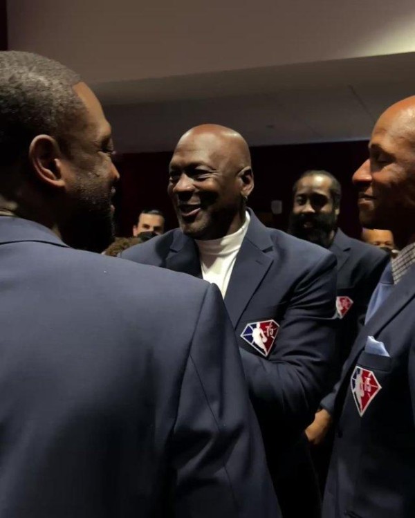 图为场下迈克尔-乔丹与其他入选75大球星的好友在一起,尽管离开“江湖”多年,但无论他走到哪里,他都是人群的焦点。
