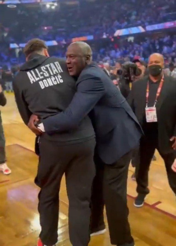 图为飞人迈克尔-乔丹在场地中间“偷袭”东契奇得手,他尝试把东契奇抱起来,童心未泯。
