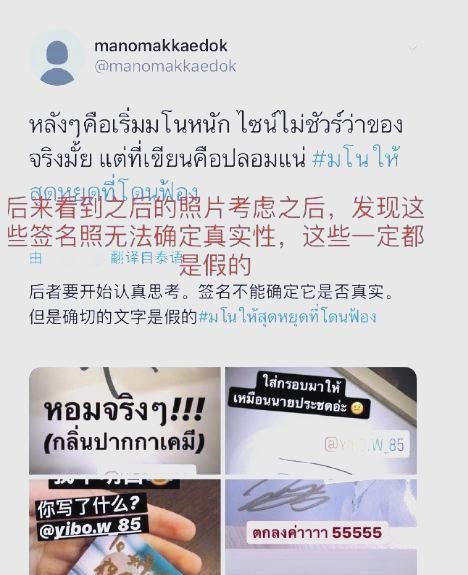 然而,经过众多粉丝的深入调查,真相逐渐浮出水面。实际上,这位推主并非真正的王一博女友,而是利用假冒的签名照来误导公众。这位泰国私生饭在推特上展示了许多声称是王一博的签名照,甚至还包括一些特别的to签。她声称,这些签名照中的许多都是在她生日时收到的,还有一些奇特的to签。然而,经过粉丝们的仔细调查,这些所谓的签名照和to签均被证实为假冒伪劣产品。显然,经过调查,这位私生饭晒出的“签名照”和合照皆为伪造,她的想象力和创造力相当丰富,但她的所有臆想都未能触及真相。