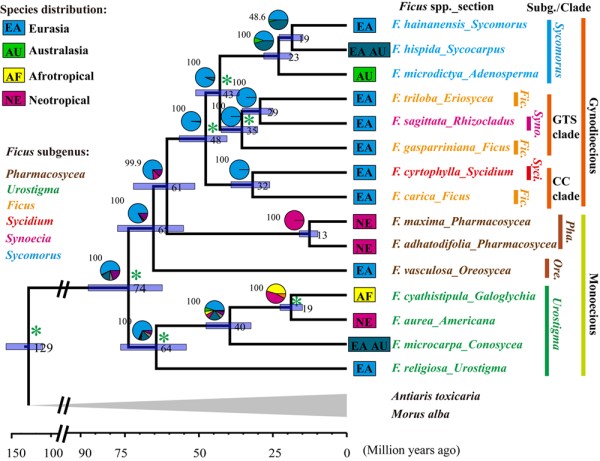 榕属物种树和分化历史推算支持榕属主干类群的历史同域分布属性(基于溯祖原理的Astral tree,分化时间和分布区推算,及主要分类关系的展示)。