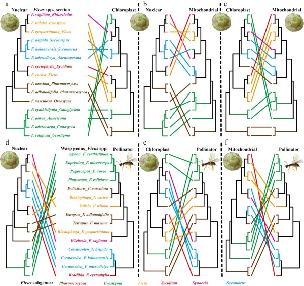 榕属主干类群的不同基因组组分(核基因组、叶绿体基因组和线粒体基因组)之间及其与对应传粉榕小蜂之间的系统树的不一致性。结果提示榕树三套基因组组分和传粉榕小蜂均存在着各不相同的进化历史。