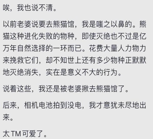 而关于熊猫的脾气,确实难以捉摸。有人称其温顺可爱,但也有说法指出,当它们发起脾气来,可是毫不留情。动物管护员与熊猫相处时必须格外小心,因为熊猫生气时毫无预兆,转眼间就可能变得凶猛异常,成都人形容这种性格为“有点儿脾气”。同时,有人调侃熊猫身上缺乏独特的气味,这与北方动物馆中的东北虎截然不同。那些大型猫科动物一踏入馆内,便散发着浓烈的气息,而熊猫馆却仿佛置身于清新的自然之中。空气都清新宜人。在炎炎夏日,若你踏入熊猫馆,会感受到馆内凉爽的空调气息。此时,熊猫们纷纷趴在冰块上,伸展着爪子装作瘫痪,这样的场景无不令人感到愉悦。