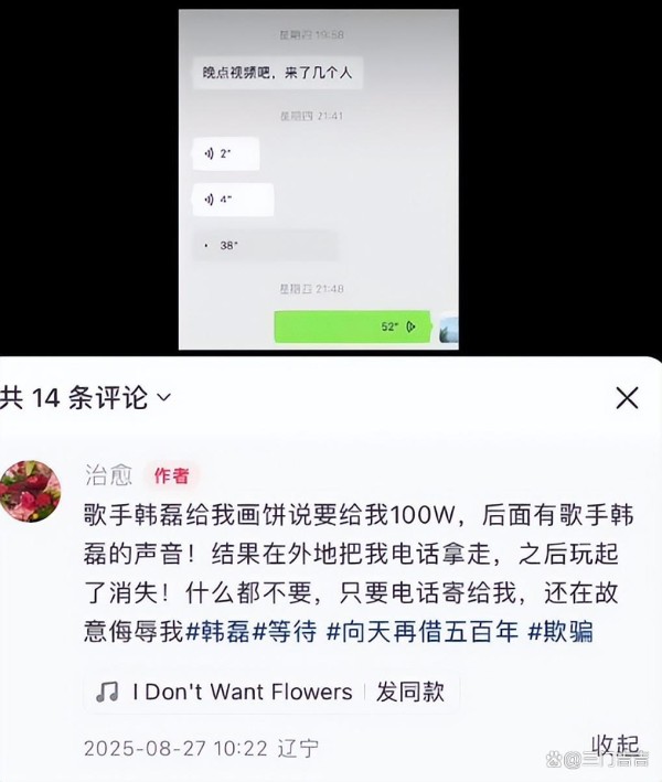 8月27日,网名为“治愈”的女网友突然在网上连发多篇帖子指控韩磊。