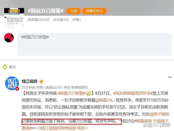 但显然他的沉默未能平息舆论,8月27日晚,韩磊方回应已就此事报警,还将发布声明。