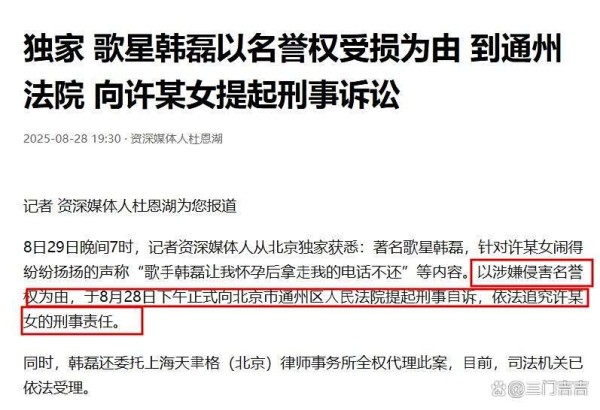 据独家消息,8月28日下午,韩磊以涉嫌侵害名誉权为由,向北京市通州区人民法院提起刑事自诉,追究许某女刑事责任。