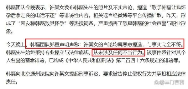 据杜恩湖报道,韩磊团队严正声明,“许某女言论是恶意捏造,与事实不符”,并强调韩磊坚守专业操守与法律底线,未涉任何不当行为。