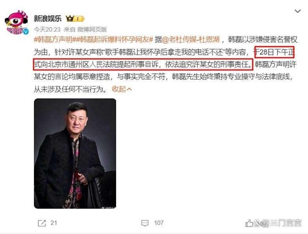 一般明星起诉网友多走民事诉讼程序,韩磊却直接对许某女提起刑事诉讼,可见他愤怒至极,此事对其生活和工作影响极坏。