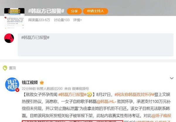 可是,他的沉默显然没法让这事儿就此过去,到了8月27日晚上,韩磊那边也出来说话了,说已经报警了,还会发布正式声明。