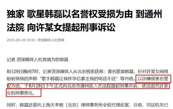 据他独家掌握的消息,韩磊已经以涉嫌侵害名誉权为由,于8月28日下午正式向北京市通州区人民法院提起了刑事自诉,打算依法追究许某女的刑事责任。
