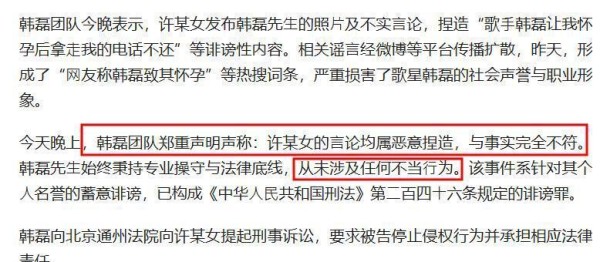 韩磊团队觉得,许某女的举动就是在故意抹黑韩磊的名声,属于蓄意的污蔑行为。