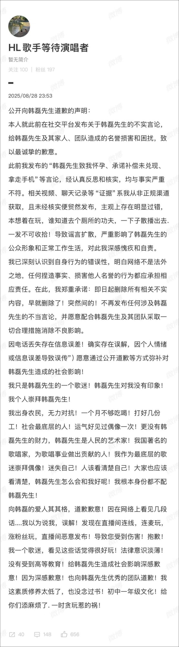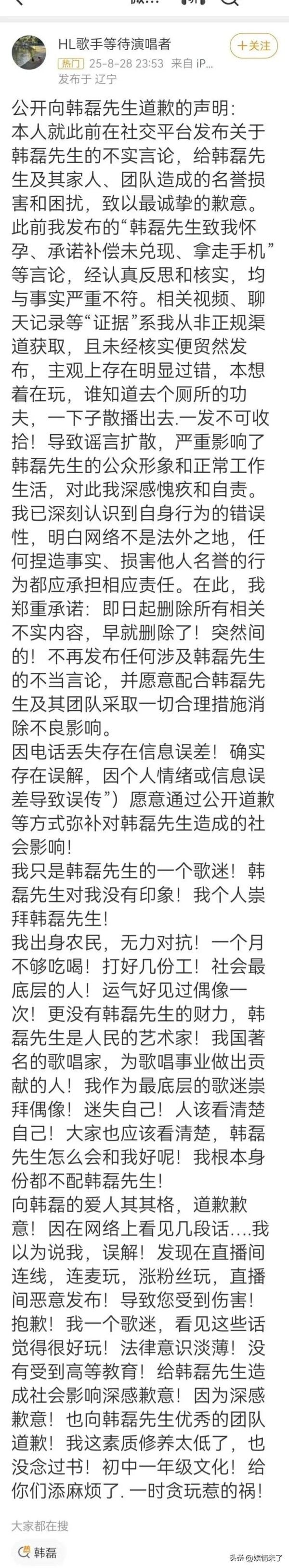 但这不仅仅是围观者的狂欢,当事人也在不断为自身立场发声。28日深夜,一个名为“HL歌手等待演唱者”的网友突然发长文道歉,疑似就是之前爆料的女网友。她承认那些视频和聊天记录都并非来自正规渠道,而她本人并没有经过仔细考虑就随手转发,导致事态扩大。她还主动坦白自己只是韩磊的普通歌迷,见过面后太激动才发帖造谣,韩磊实际上根本不认识她。这样的反转让很多网友开始质疑:那么,那些照片和语音到底是真是假?这真的只是“一场误会”吗?