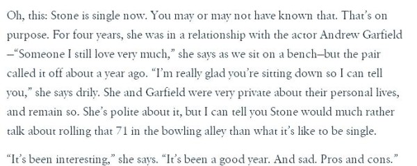 8月间,两人被媒体捕捉到携手漫步,欢声笑语不断。10月份,《Vogue》杂志也推出了与两位主角的采访专题。谈及加菲,石头姐深情地描述道:“他是我至今仍深爱着的人。”然而,尽管石头姐坦言她依然深爱着加菲,但事实上,两人已经彻底结束了。