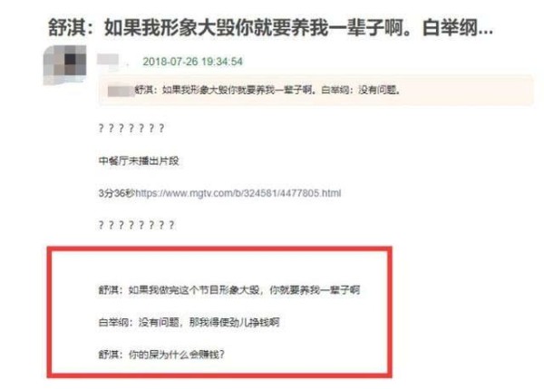 7月26日有网友发帖称自己看了中餐厅未播出片段,其中有一段舒淇与白举纲当着王俊凯调情的画面。这个画面可能是让这位网友倍感不适,所以才发到了网上。