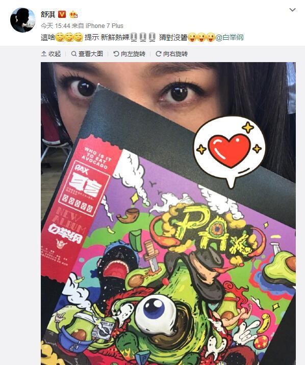 舒淇手拿白举纲的专辑自拍,似乎是很卖力的在为他的新专辑宣传。她还在文末连发了三个眨眼吐舌的调皮的表情,舒淇的这个举动让两人的亲密关系不言而喻。