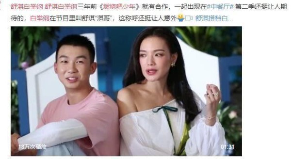 其实舒淇跟白举纲在三年前的《燃烧吧少年》中就有过合作,当时舒淇就表示要自己战队的人都叫自己淇哥,所以直到现在白举纲也这么称呼她,相信也让舒淇对这个弟弟倍感亲切。