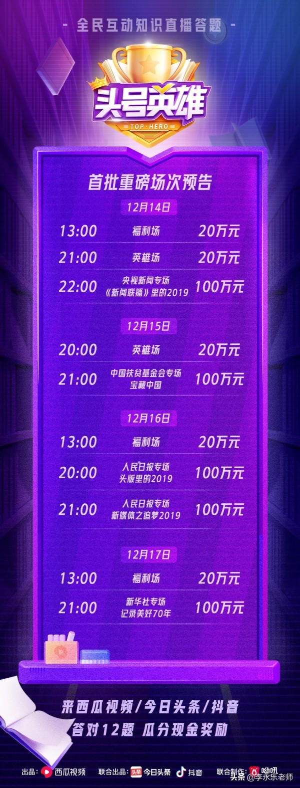 大家好,我是李永乐老师,今天西瓜视频的运营同学告诉我,当年风靡全网的答题直播活动又来了。今年的#头号英雄#不但影响力会超过往年的10倍以上,还邀请到了诸多明星主持直播,有央视「国脸」康辉、局座张召忠、腾格尔、李诞、许晴等等明星。