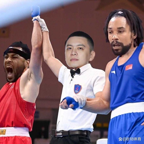 杨鸣化身为拳击比赛的裁判,莫兰德和深圳外援萨林杰分别是两位拳手。只见杨鸣高举莫兰德的手臂,示意其获得胜利。