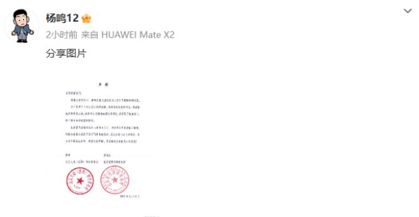 12月5日,杨鸣在个人社交账号上宣布离婚,他写道: